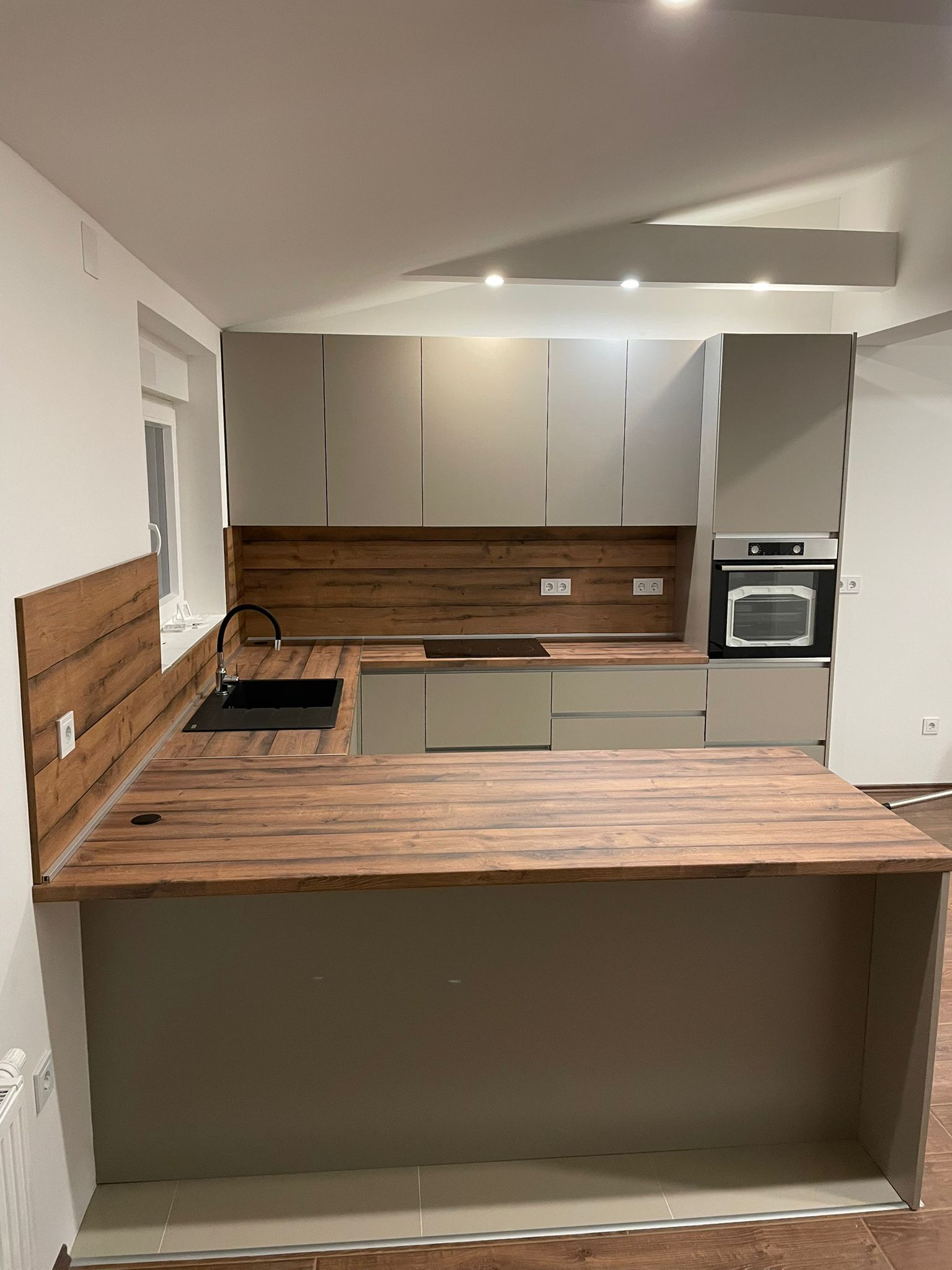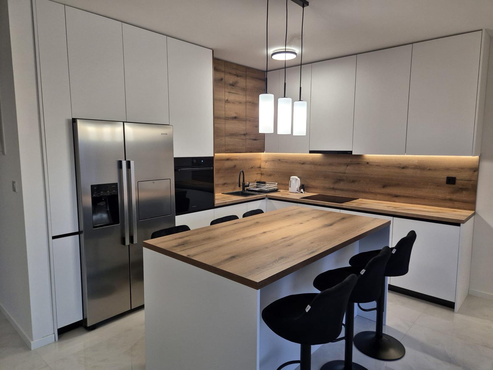 Za kompaktan tlocrt odabrali smo “U” raspored koji daje kontinuiranu radnu liniju i maksimalno spremište. Sudoper je smješten uz prozor zbog prirodnog svjetla, ploča za kuhanje u središnjem kraku, a hladnjak na ulazu radi jednostavne cirkulacije. Fronte u svijetlom mat laku ublažene su detaljima u dekoru oraha za toplinu, dok su radne plohe od laminata visoke otpornosti izabrane radi izdržljivosti i lakog održavanja. Gornji elementi do stropa sprječavaju skupljanje prašine, a unutarnji okovi s punim izvlačenjem i “soft-close” olakšavaju pristup. Kontinuirana LED rasvjeta ispod elemenata osigurava ravnomjernu iluminaciju, a skriveni podizni moduli drže utičnice i kablove pod kontrolom.