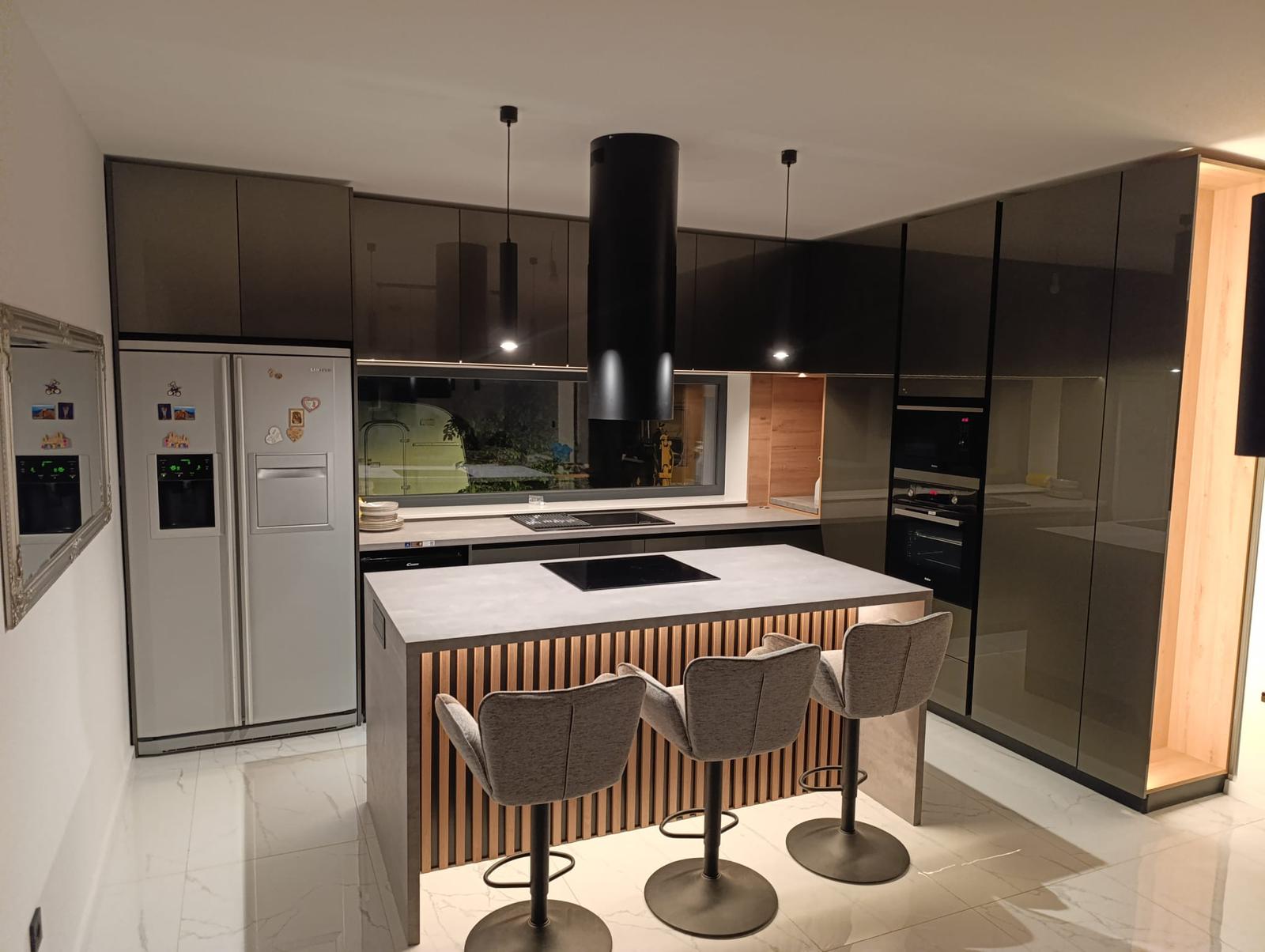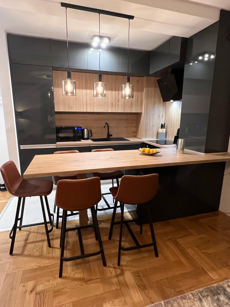 Kuhinja je osmišljena kao otvoreni prostor s otokom koji spaja pripremu hrane i svakodnevno druženje. Glavni radni trokut (hladnjak–sudoper–ploča) optimiziran je za kratke korake, dok otok nudi dodatnu radnu plohu otpornu na ogrebotine i temperaturu. Donji elementi imaju pune ladice s mekim zatvaranjem radi boljeg pregleda, a visoki ormari skrivaju ugradbenu pećnicu i aparat za kavu i mikrovalnu u visini pogleda. Kombinirali smo topli dekor hrasta s mat grafit frontama radi kontrasta i vizualne čistoće. LED profili u utorima daju ravnomjerno svjetlo bez blještanja, a utičnice su diskretno integrirane. Naglasak je na lako čišćenje, bešavne spojeve i trajne materijale.