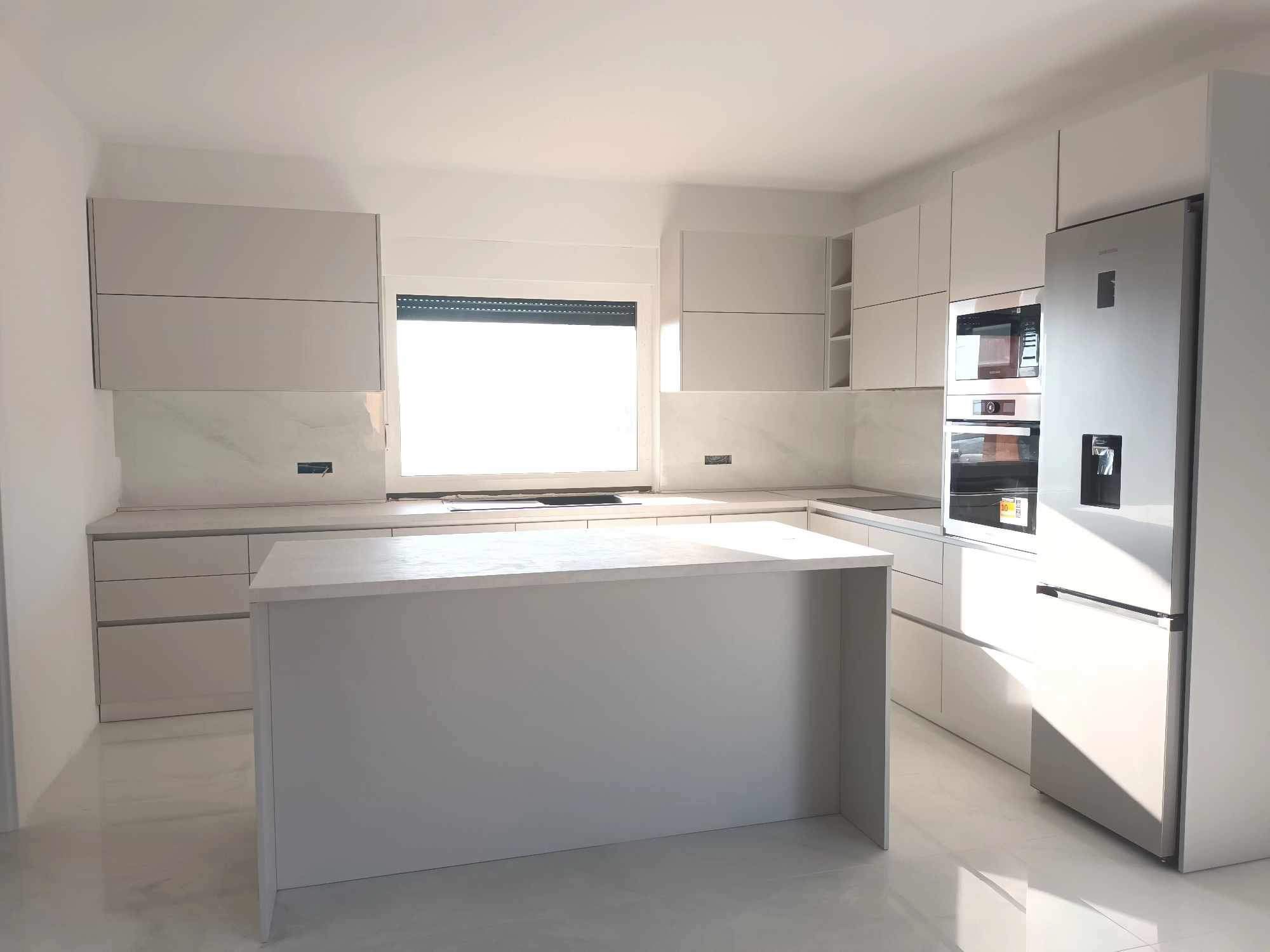 Za kompaktan tlocrt odabrali smo “U” raspored koji daje kontinuiranu radnu liniju i maksimalno spremište. Sudoper je smješten uz prozor zbog prirodnog svjetla, ploča za kuhanje u središnjem kraku, a hladnjak na ulazu radi jednostavne cirkulacije. Fronte u svijetlom mat laku ublažene su detaljima u dekoru oraha za toplinu, dok su radne plohe od laminata visoke otpornosti izabrane radi izdržljivosti i lakog održavanja. Gornji elementi do stropa sprječavaju skupljanje prašine, a unutarnji okovi s punim izvlačenjem i “soft-close” olakšavaju pristup. Kontinuirana LED rasvjeta ispod elemenata osigurava ravnomjernu iluminaciju, a skriveni podizni moduli drže utičnice i kablove pod kontrolom.